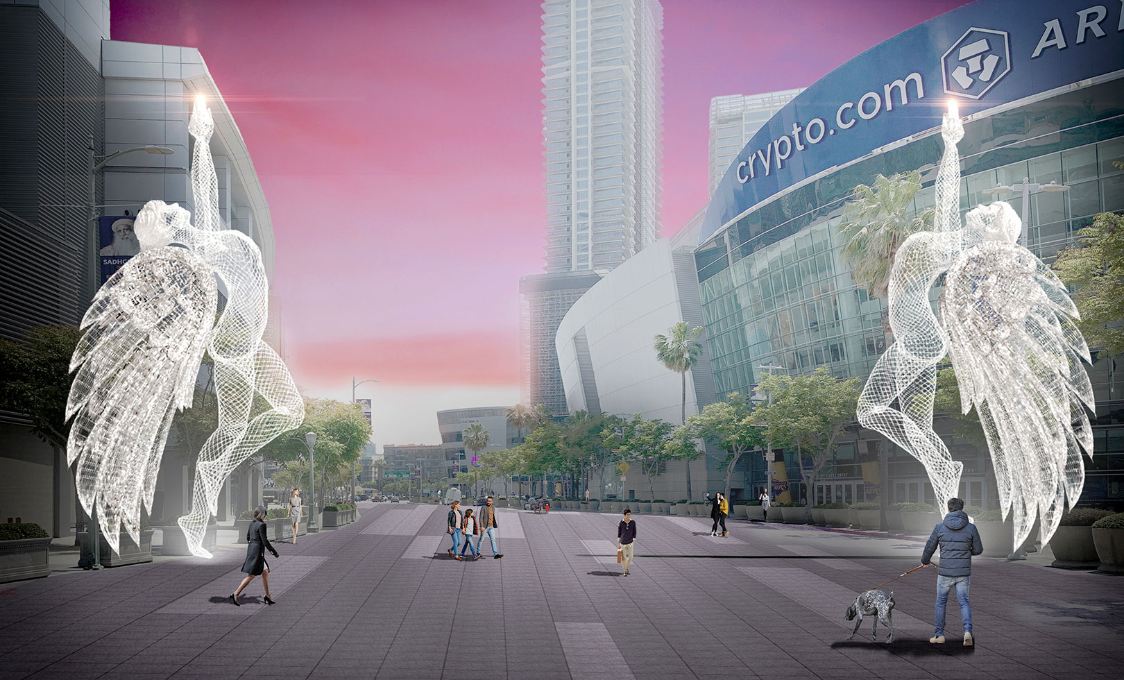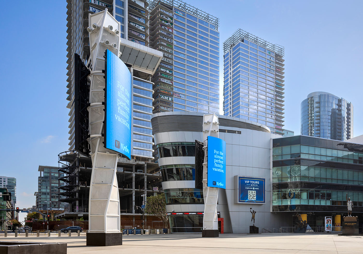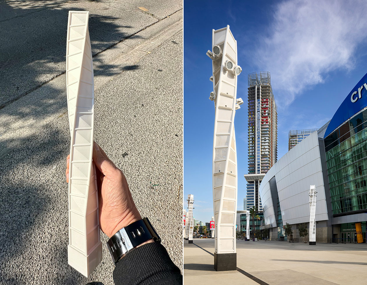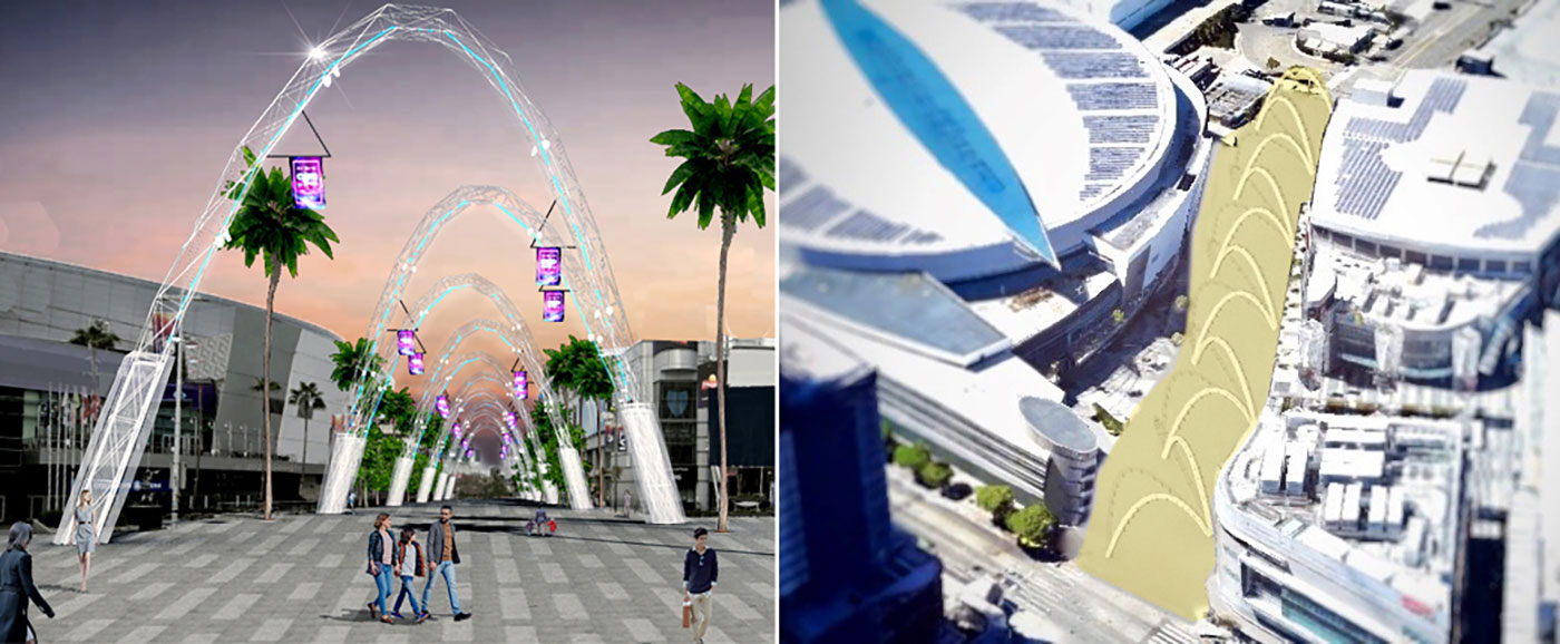 Our 11 media towers (four at 58’ tall and seven at 37’)—blend architecture, sculpture, art, technology and urban design. Infilled with expanded metal mesh, the twisting box trusses provide visual curiosity, experiential interest and structural resistance. Diagonally staggered, the towers flank this new Chick Heart Court. The four taller towers—each equipped with a pair of 13’ by 23’ curved digital screens—frame the most active area of the plaza, an area that greets the 20,000 attendees for a Lakers’/Kings’ game or music concert.