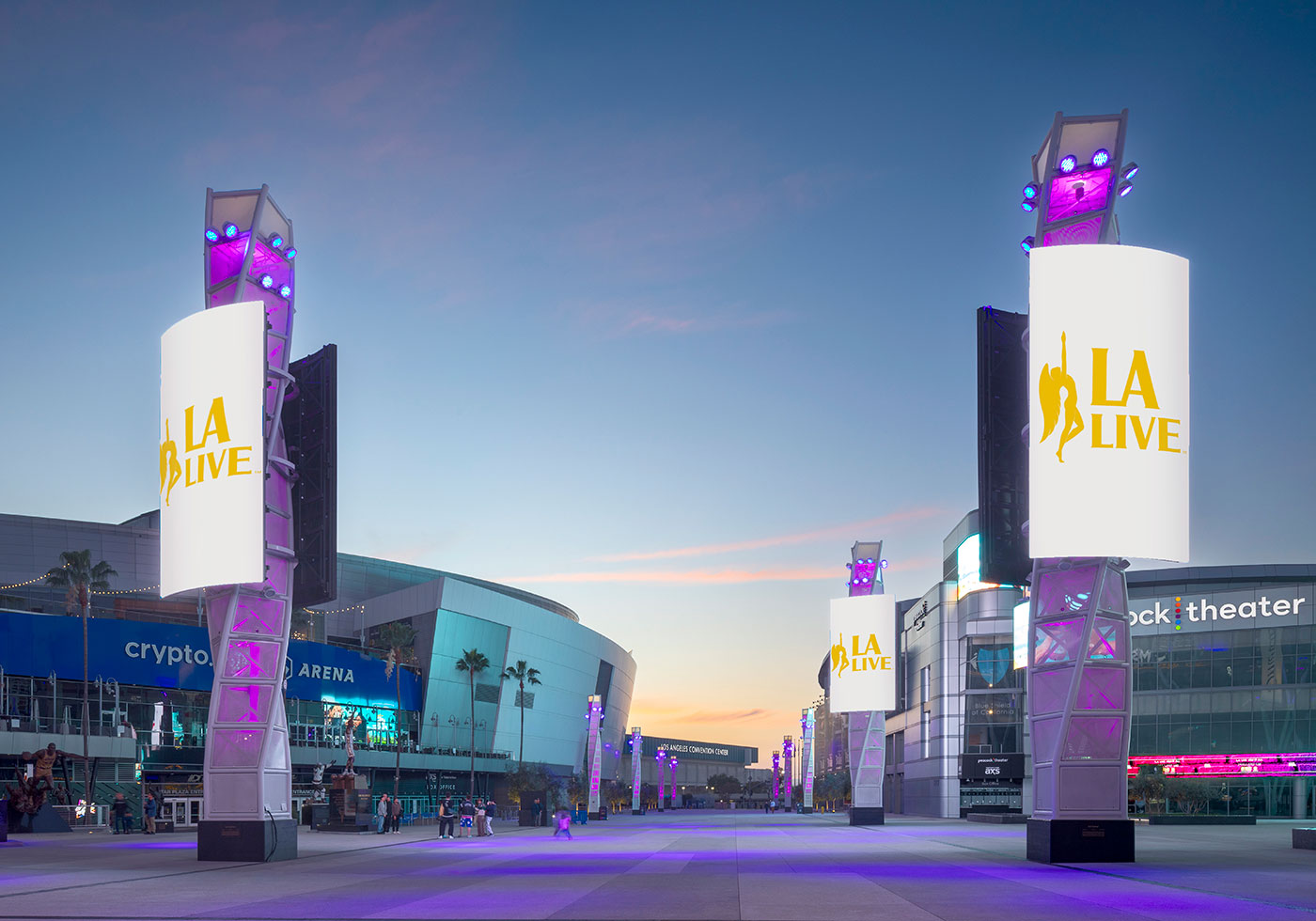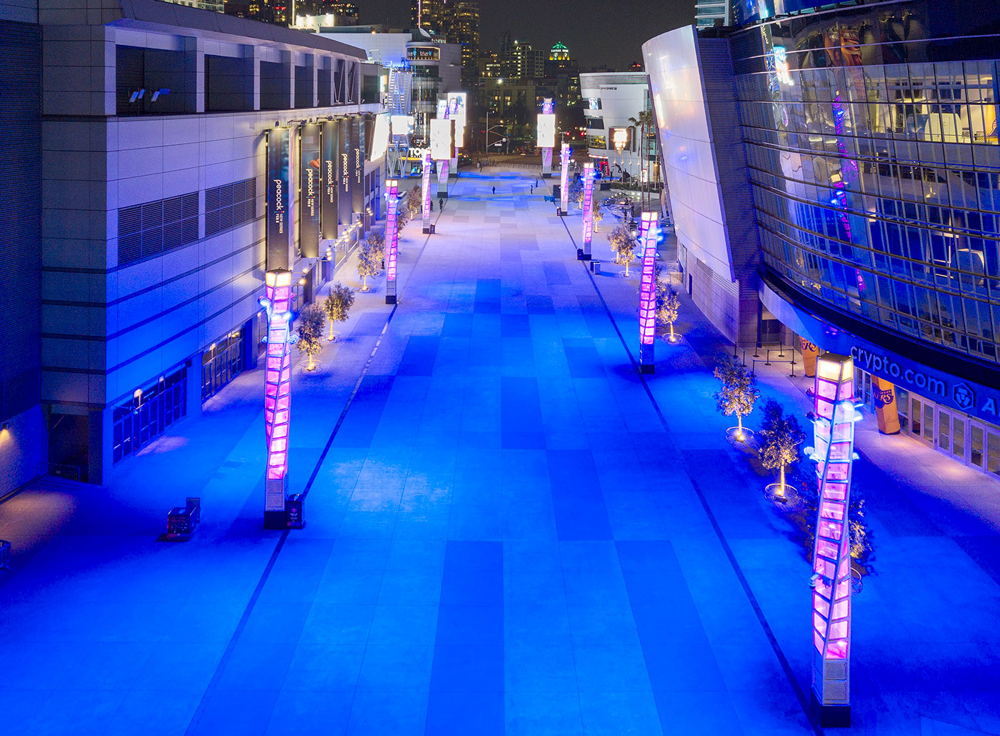 L.A. Live, a premiere destination for live entertainment in Los Angeles, sought a new civic space. Between Crypto.com Arena and Peacock Theater—and adjacent to the convention center, Ritz-Carlton, JW Marriott, restaurants, shops, bowling alley, cinema, and museum—sits a six-lane, 1/3 mile long vehicular thoroughfare. The design agenda closes this road to vehicular traffic, eliminating the street and adjacent curbs and sidewalks. The result transforms the existing conditions into a grand pedestrian plaza of over three acres.