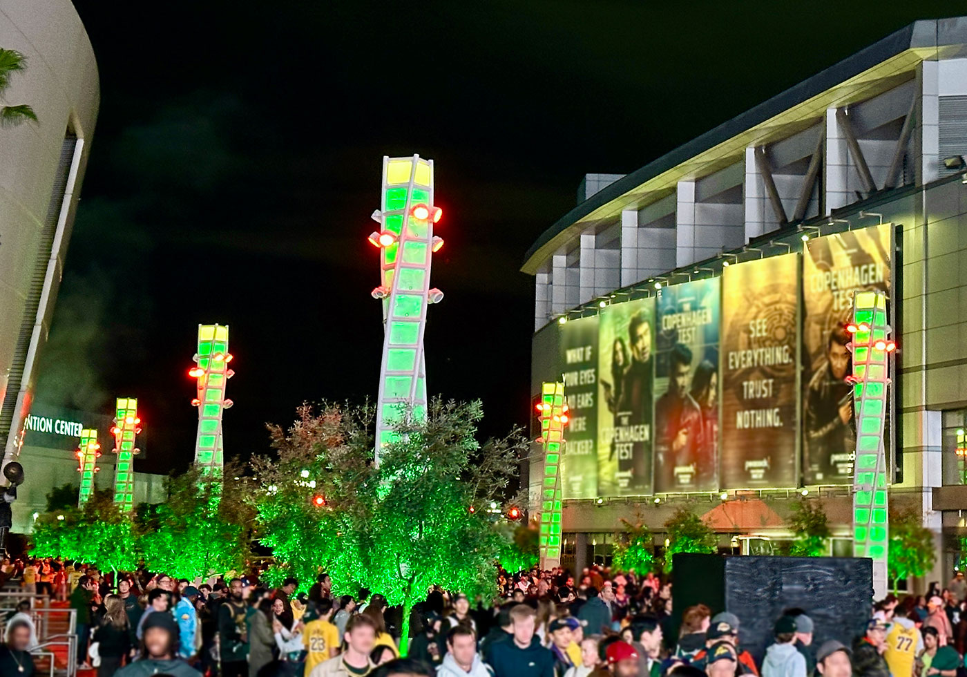 Our ten media towers (three at 58’ tall and seven at 37’)—blend architecture, sculpture, art, technology, and urban design. Infilled with expanded metal mesh, the twisting box trusses provide visual curiosity, experiential interest, and structural resistance. Diagonally staggered, the towers flank this new Chick Heart Court at L.A. LIVE. The three taller towers—each with a pair of 13’ by 23’ curved digital screens—frame the most active area of the plaza, a space that greets the 20,000 attendees for a Lakers’/Kings’ game or music concert.